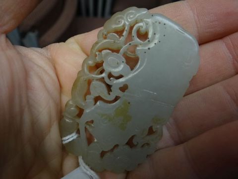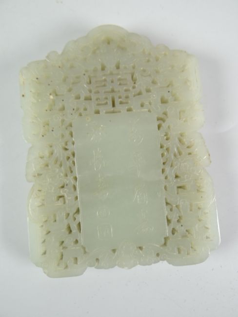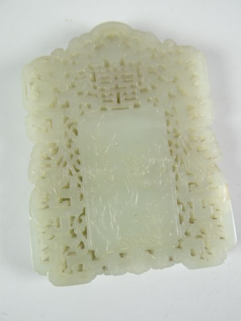 PALE JADE SMALL PEDESTAL BOWL together with carved & pierced jade panel depicting fantastic bird with character mark to reverse together with small carved jade pendant (3)