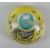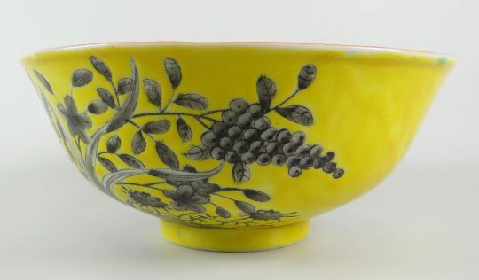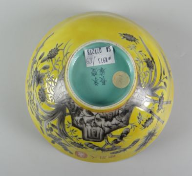 CHINESE PORCELAIN PEDESTAL BOWL having yellow ground exterior decorated with flowers & trees with turquoise ground interior & base, with four character marks to base, 16.5cms diam x 7cms high