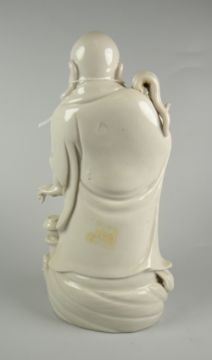 Condition Report: right thumb is missing, left little finger missing, some surface wear & firing flaws to interior. His staff is also loose in hand.