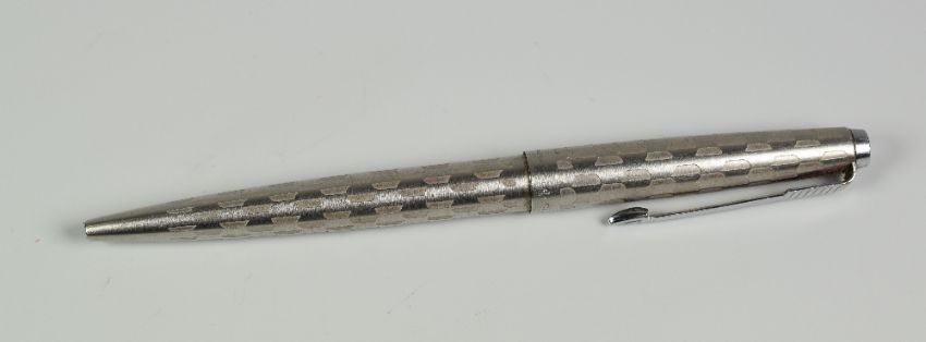 VINTAGE STAINLESS STEEL PARKER 45 HARLEQUIN GREY SHIELD BALLPOINT PEN with chrome trim, date stamped for 1980