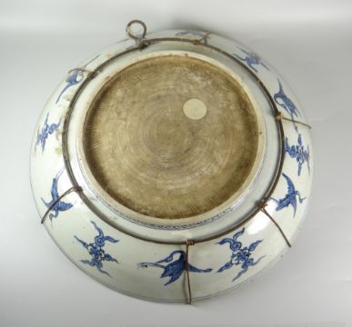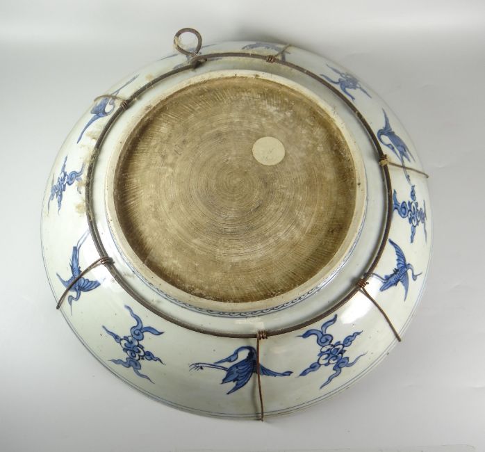 LARGE CHINESE PORCELAIN BLUE & WHITE WALL CHARGER with central panel depicting junk boat, island, pine trees & the moon with floral & scroll border, unmarked, 43cms diam x 9.5cms high