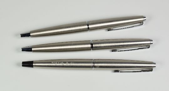 THREE STAINLESS STEEL PARKER 45 BALLPOINT PENS one early original Flighter with black plastic tail cap & 'WR Baker' engraved on barrel