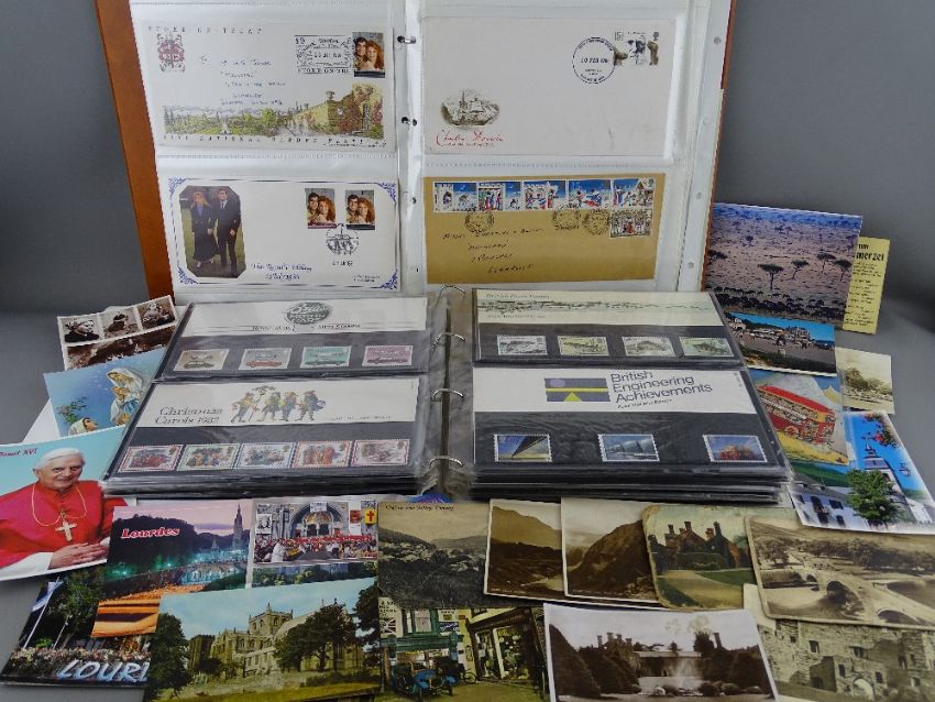 A two-album collection of first day covers, commemorative & other Mint stamps with a small collection of vintage postcards