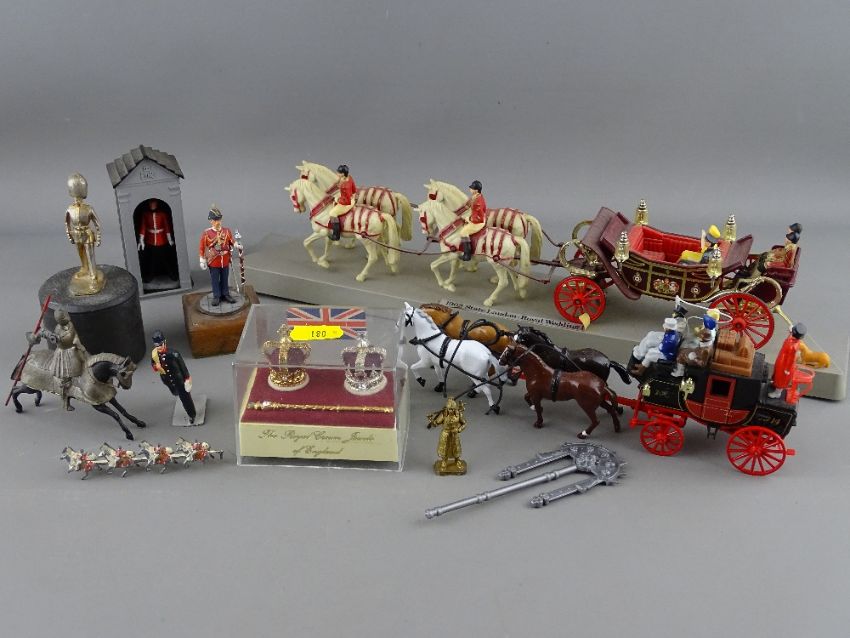 A collection of diecast & other models of horse drawn coaches & uniformed men etc
