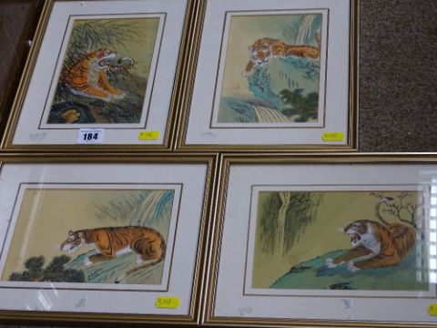 Four framed Oriental watercolours on fabric - tigers in naturalistic poses, all with block iron red character marks to the side, two 18 x 12 cms, two 12 x 18 cms