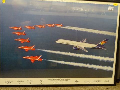 JOHN M DIBBS framed photographic print of the Red Arrows with an Airtours Boeing 757, individually signed by the aerobatic team