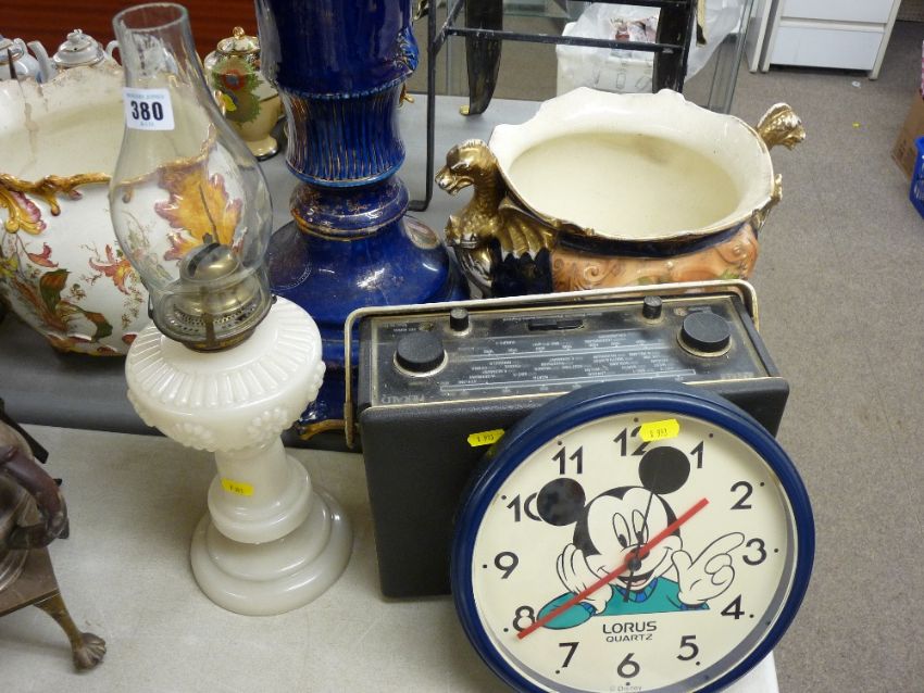 A Victorian-style oil lamp, a vintage Hacker Herald radio & a Mickey Mouse quartz wall clock