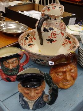 Staffs pottery jug and bowl set and three Royal Doulton character jugs including 'Lobster Man' and 'Falstaff'