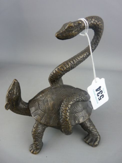 Oriental bronze model of a terrapin/tortoise, its shell coiled by a snake