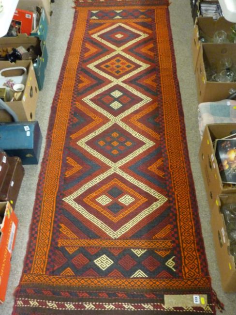 Suzni Kelim carpet runner, autumnal tones with repeating diamond central block with triple border, 270 x 80 cms
