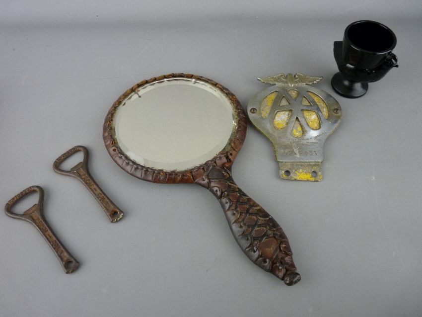 Embossed leather hand mirror, vintage AA car badge, two Pepsi Cola bottle openers and a French black glass eggcup in the form of a bird