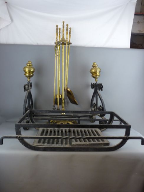 A PAIR OF VINTAGE WROUGHT IRON BRASS TOPPED FIRE DOGS, a 61 x 30 cms fire basket and an antique style brass set of fire irons on a pierced floral stand, 81.5 cms high