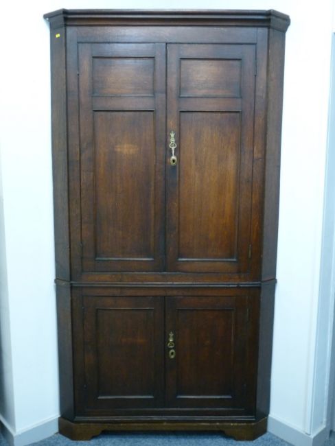 A GEORGE III OAK FLOORSTANDING CORNER CUPBOARD having double panel twin upper doors and original green paint interior, over single panel lower doors on a modern bracket foot base, 214 cms high, 114 cms wide