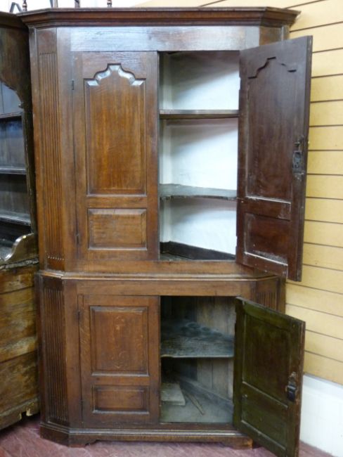 AN ANTIQUE OAK TWO PIECE STANDING CORNER CUPBOARD, twin upper and lower doors having shaped and chamfered panels and canted sides with reeded decoration, 196 cms high, 118.5 cms wide, 62.5 cms deep