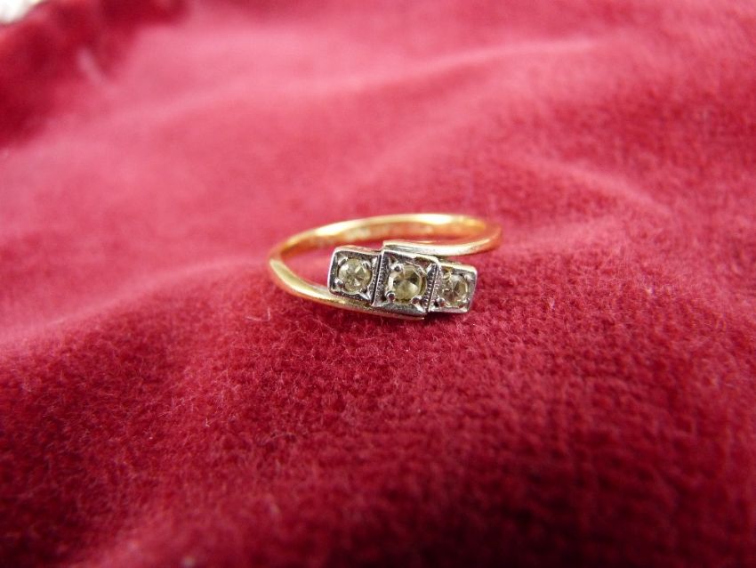 AN EIGHTEEN CARAT GOLD THREE-STONE DIAMOND RING each in a square setting, visual estimate 0.8 carats, total 2.4 grms, size L