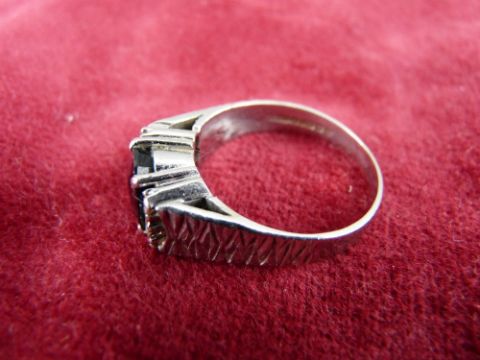 AN EIGHTEEN CARAT WHITE GOLD BLACK SAPPHIRE & SIX SMALL DIAMONDS RING, 7 grms, size 'P'