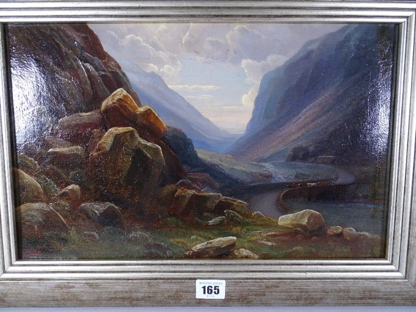 THOMAS FINCHETT oil on canvas - Llanberis Pass with drover and cattle on the bridge, signed, 24 x 39 cms