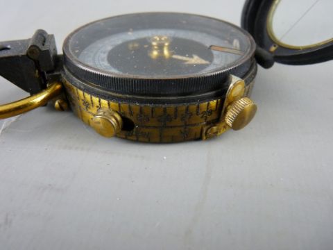 A LEATHER ENCASED MILITARY-STYLE BLACK METAL & BRASS POCKET COMPASS (no maker's mark visible)