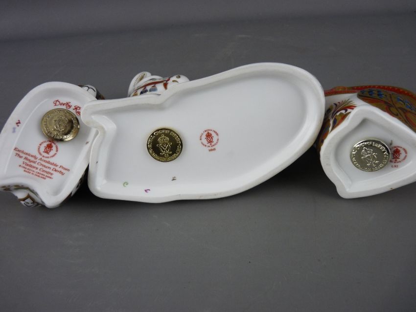 THREE ROYAL CROWN DERBY PAPERWEIGHTS, 'Derby Ram', 'Squirrel' numeral marked LXI and 'Recumbent Donkey' MMI, all with gold stoppers