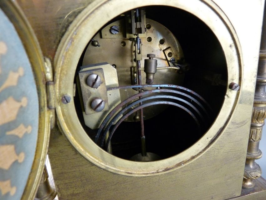 A 19th CENTURY FRENCH LACQUERED BRASS MANTEL CLOCK having gilt pierced dial detail and Arabic numerals, before an Ad Mougin movement, striking on a coiled gong, pendulum and key included, 35.5 cms high overall, 22 cms wide