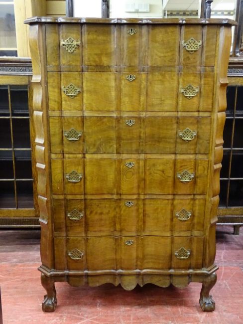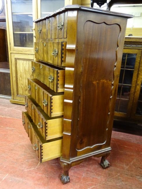 A GOOD REPRODUCTION WALNUT SIX DRAWER CHEST with shaped top and drawers, pierced brasswork, on ball and claw supports, 133 cms high, 87 cms wide maximum, 51 cms deep