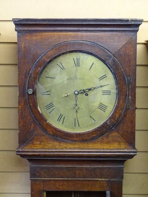 A 19th CENTURY OAK CASED CIRCULAR BRASS DIAL LONGCASE CLOCK by Robert Jones, Ruthin, twin weight pendulum driven movement striking on a bell, 206.5 cms high, 50 cms wide, (lacking weights)