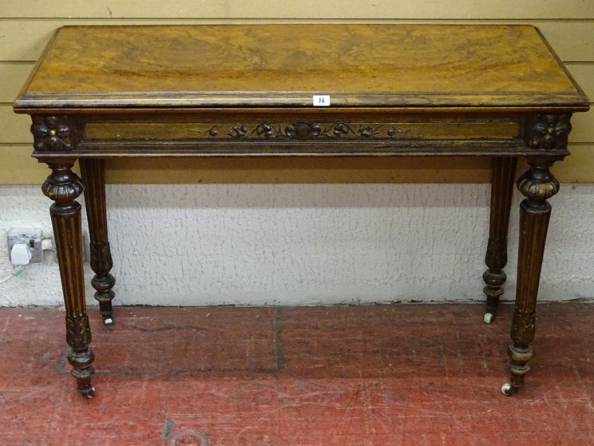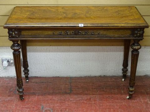 A VICTORIAN EMPIRE STYLE WALNUT FOLDOVER TOP CARD TABLE having a baize lined interior, carved frieze detail on turned and reeded supports with traces of gilt decoration, on white pot castors, the rear pull-out section on twin bearers with interior storage area, 75.5 cms high, 110 cms wide, 44.5 cms deep closed