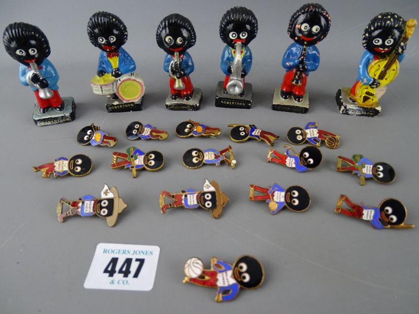 Good collection of Robertson's golly figurines and badges with maker's names by Fattorini, Richard Gomm, H W Miller and Marples & Beasley