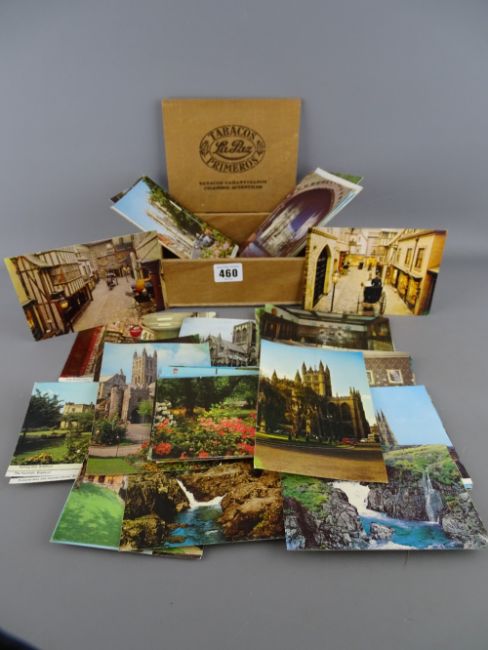 Vintage wooden cigar box containing a quantity of collectable postcards