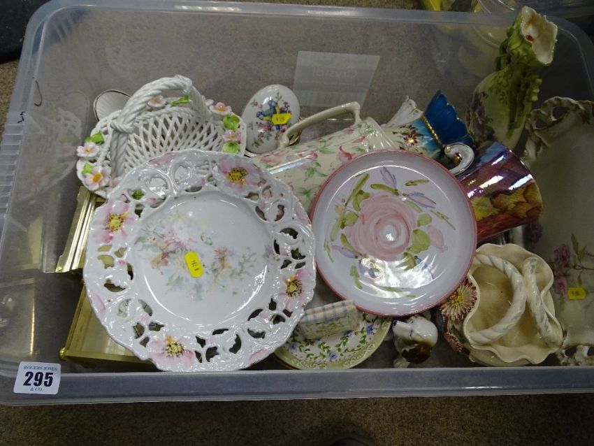Crate of decorative pottery and china, two vintage style mantel clocks etc
