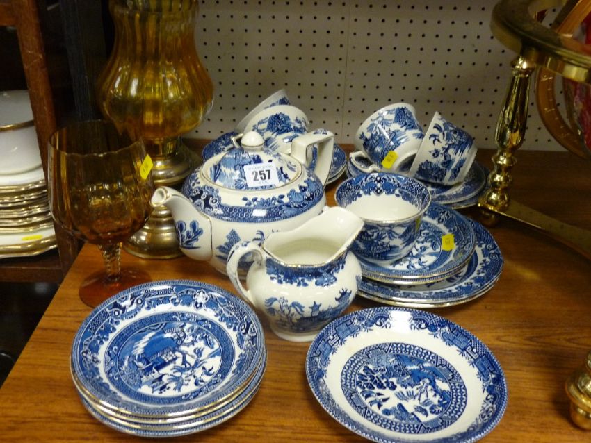 Parcel of blue Willow breakfast ware, an amber glass goblet and two brass based oil lamps