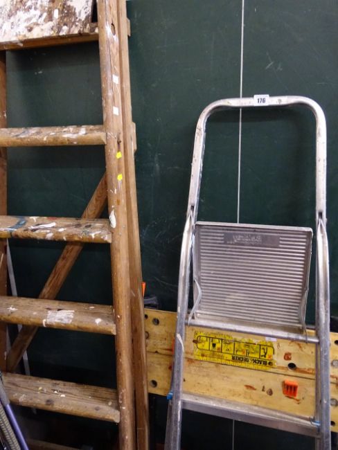 Parcel of wooden and metal stepladders, Black & Decker workbench, garden table, two chairs and a formica topped table