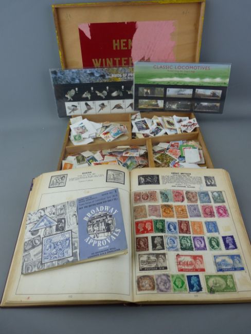 Small part filled album and booklet of stamps, an unsorted boxed quantity and two sets of Royal Mint stamps