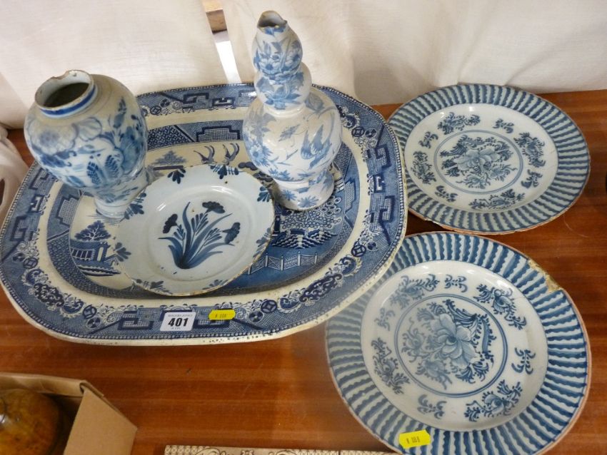 Two Delft ware blue and white vases and three various plates (damages and losses) and a Willow pattern meat platter