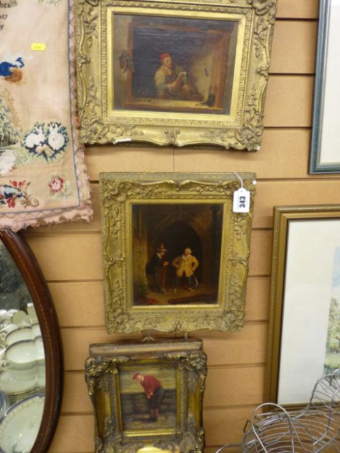 Two period Continental gilt framed oils on board and a reproduction painting of a golfer