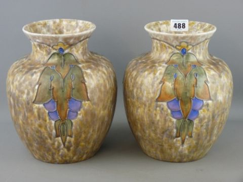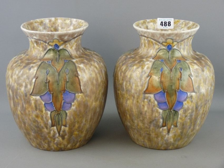 Pair of Cranston pottery vases, tube line decorated on a mottled ground