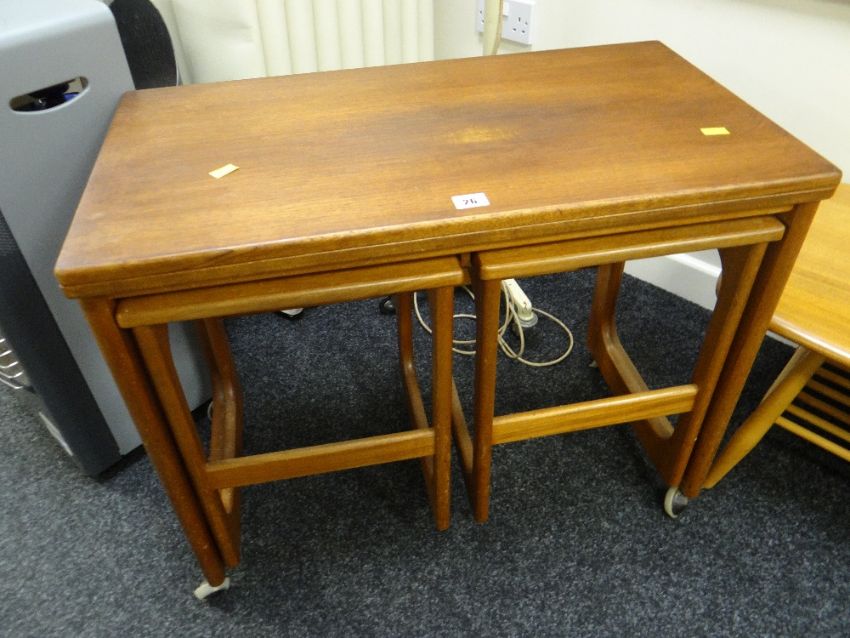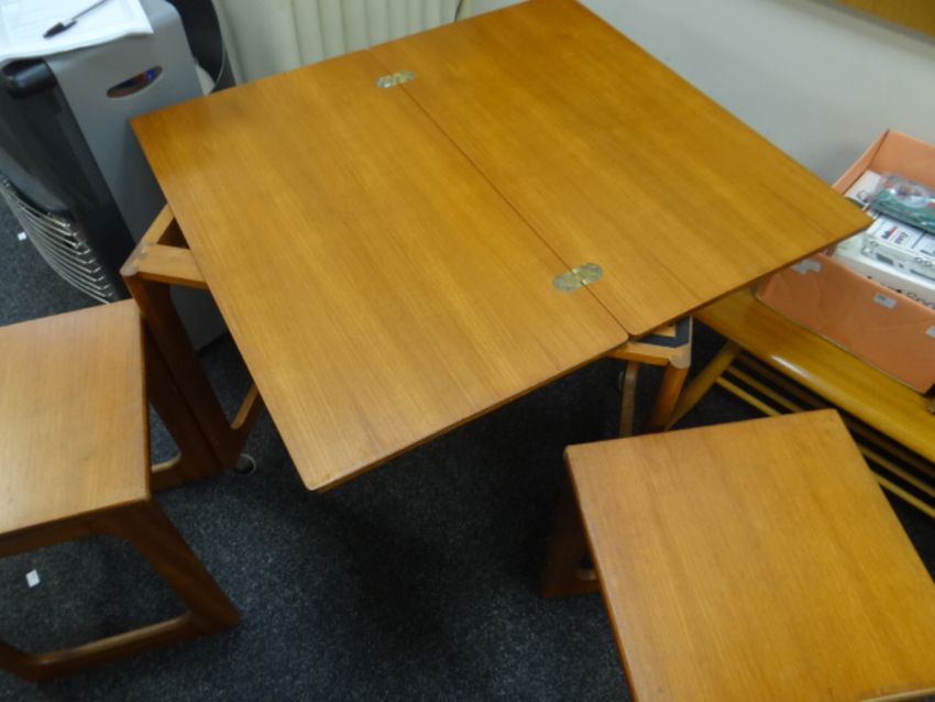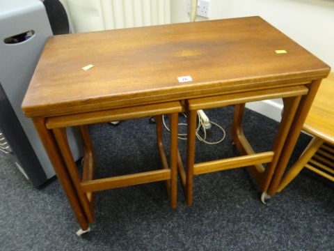 An AH McIntosh mid-century teak nest of tables, the parent being fold-over Condition reports are provided on request by email only for this type of auction, otherwise purchase 'as seen'. Condition reports done week commencing January 7th.There is some wear to the top of the larger of the tables, there is also scratches to the legs. Everything else looks good, nice and solid.