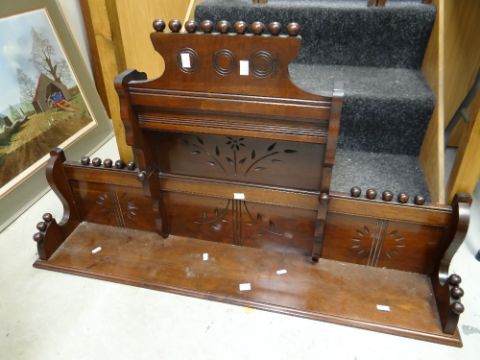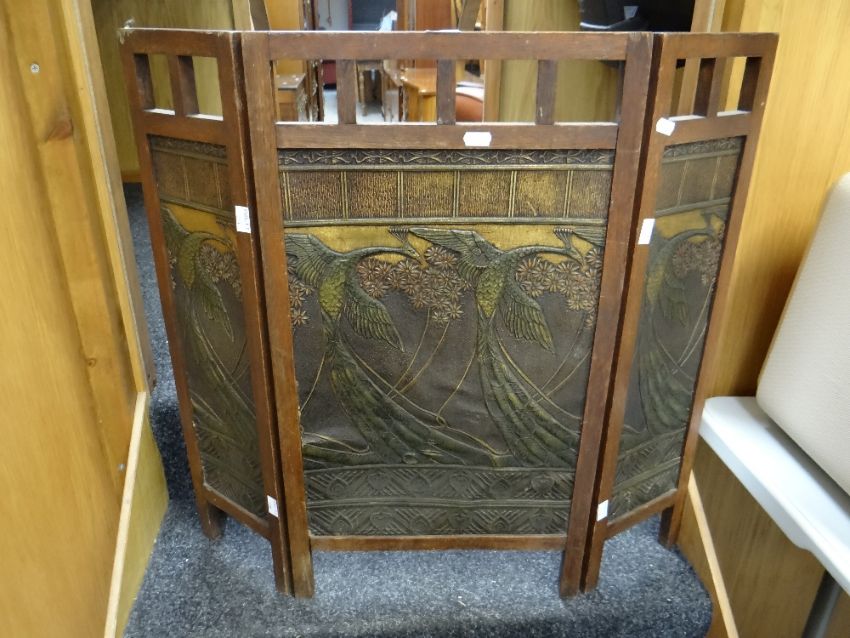 An Arts & Crafts-style tri-fold screen with painted relief decoration of exotic birds together with a similar period mahogany rail top (probably from a sideboard)