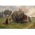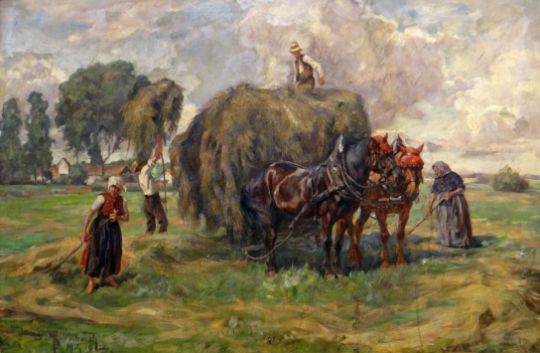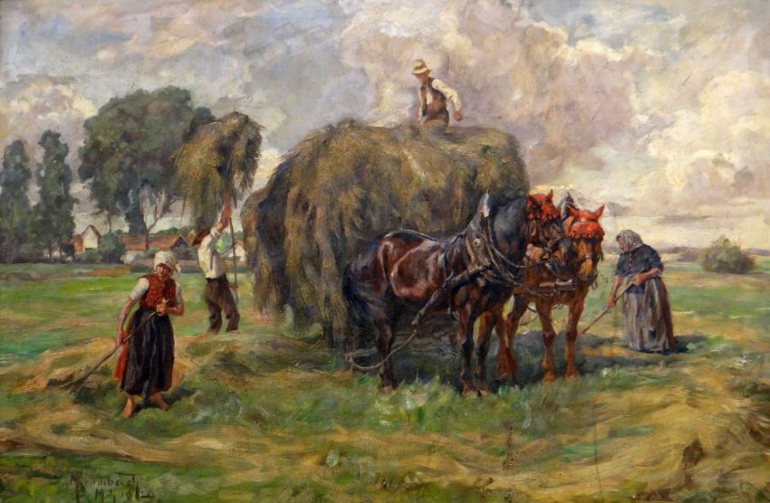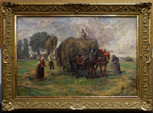 MAX KROMBACH (1867-1947) oil on canvas - large painting of a harvest scene with two bridle horses & four figures working hard in a landscape, signed & dated 1929 with partial label verso, 80 x 119cms