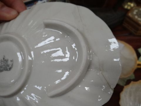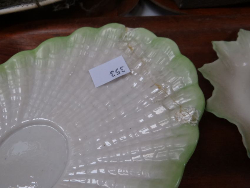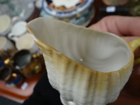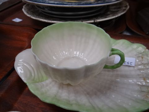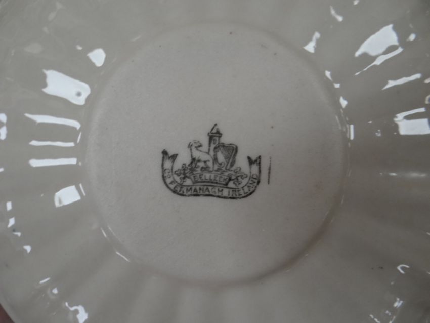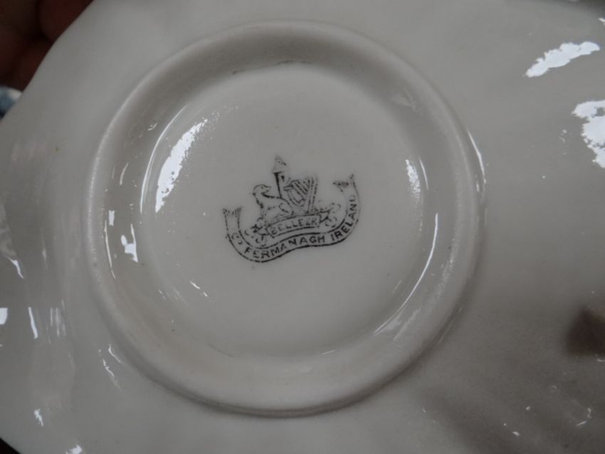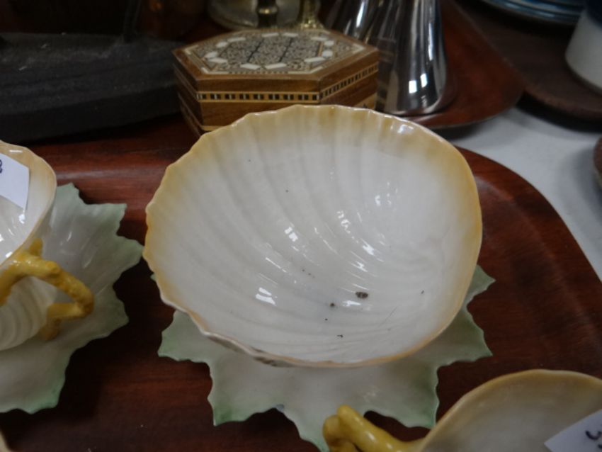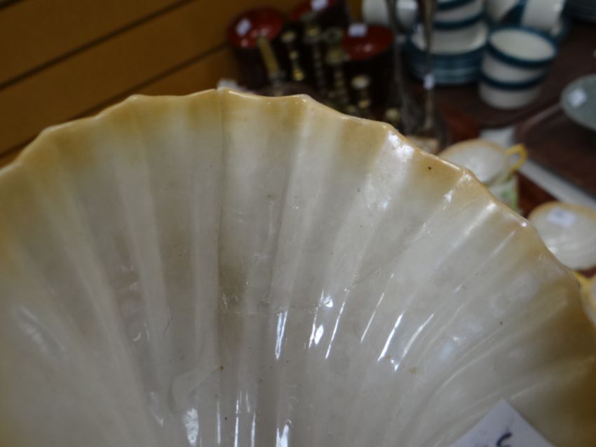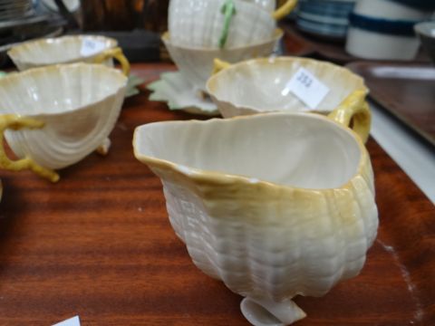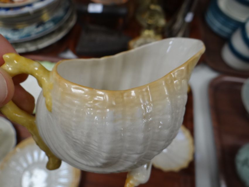 A parcel of Belleek shell-form tableware Condition reports are provided on request by email only for this type of auction, otherwise purchase 'as seen'. Condition reports done week commencing January 7th.There is some restoration to one of the cups and to one of the saucers, there are also some nibbles/small chips to a few of the edges.There are four cups and saucers, cream jug, sugar bowl.