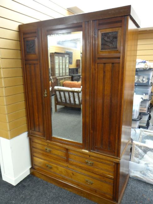 A vintage single door mirrored wardrobe with carved panels & three base drawers