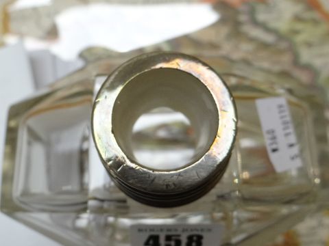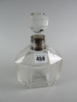A good sterling silver rimmed Art Deco decanter & stopper, 21cms high Condition reports are provided on request by email only for this type of auction, otherwise purchase 'as seen'. Condition reports done week commencing January 7th.light surface scratches all over and a few small chips to the stopper.