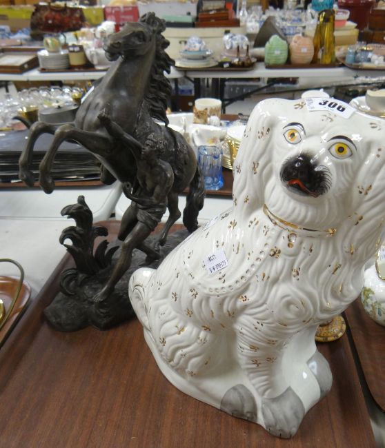 A single Staffordshire dog, a spelter sculpture of a rearing horse & figure together with a parcel of pottery & china including three items of Masonware, teaware ETC