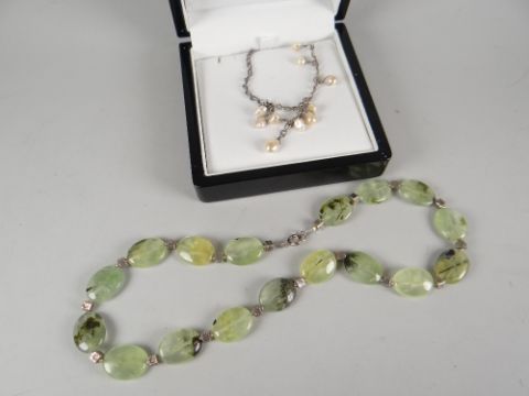 A seed pearl droplet necklace and a possibly green-jade and silver bead necklet