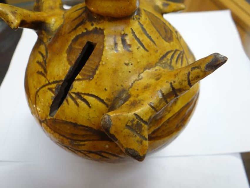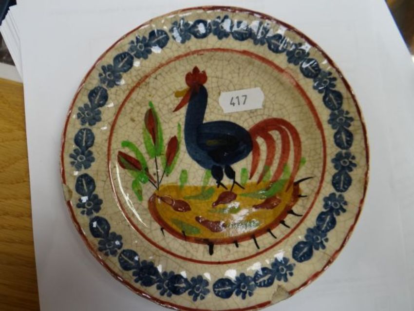 An interesting antique pottery money box vessel with mounted birds & a Llanelly pottery cockerel plate (damaged & badly crazed)