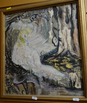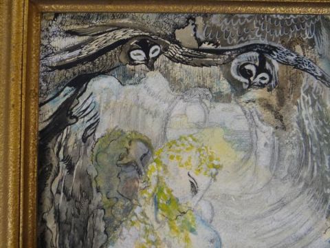 Framed mixed media on board by BERYL ROBERTS with explanation verso relating to Blodeuwedd from the Mabinogion stories together with a portrait of 'Fy Ffrind Dilys' by the same artist, circa 1960