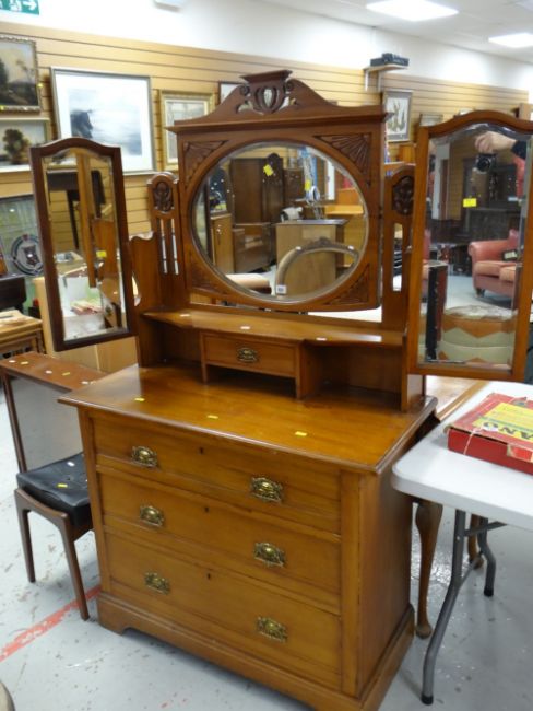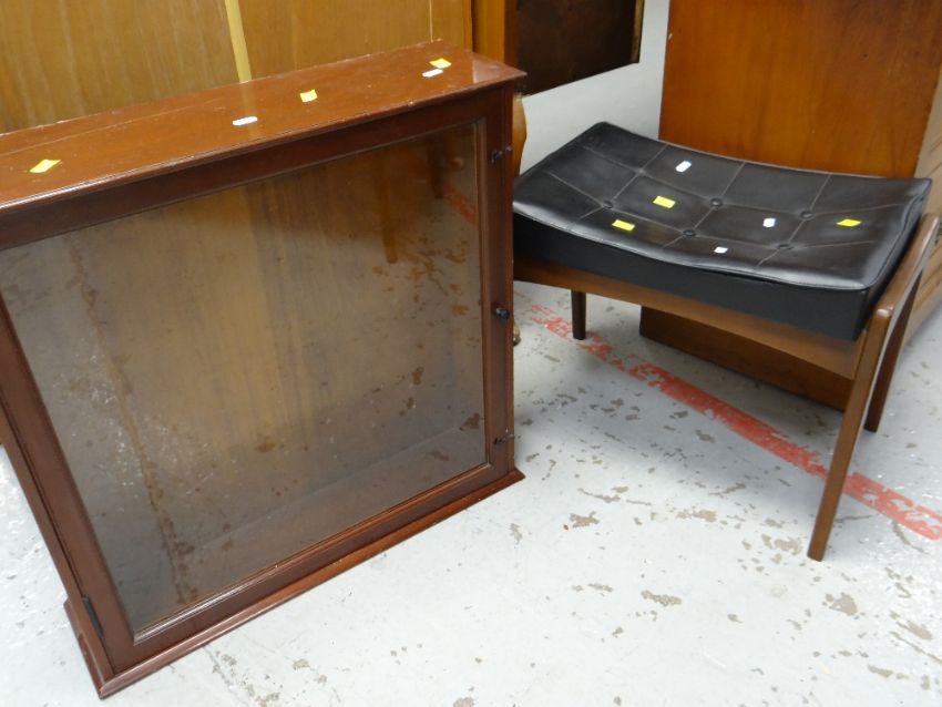 A mirror back dresser over three drawers, 168 (l) x 100 (l) x 46 (d) cms, together with a wooden display cabinet & a studded leather topped stool
