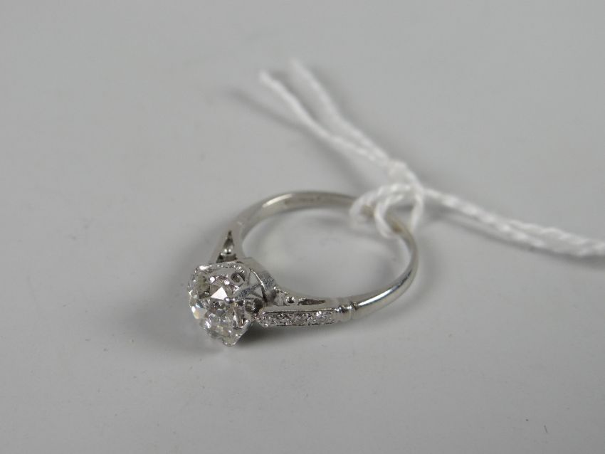 A platinum set diamond ring with diamond chip shoulders, visual estimate 1.1ct Condition reports provided on request by email for this auction otherwise items purchased `as seen`The diamond has a significant chip to girdle region, also has minor nibbles around girdle. There is also feather/crack starting in the table going to the edge.The ring size is L/M