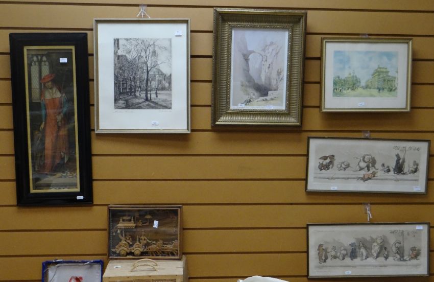 A wall mirror, an Oriental print, a nineteenth century oil painting of a fisherman, a print of a medieval figure, pair of canine cartoon prints, a print AFTER J FARQUHARSON ETC