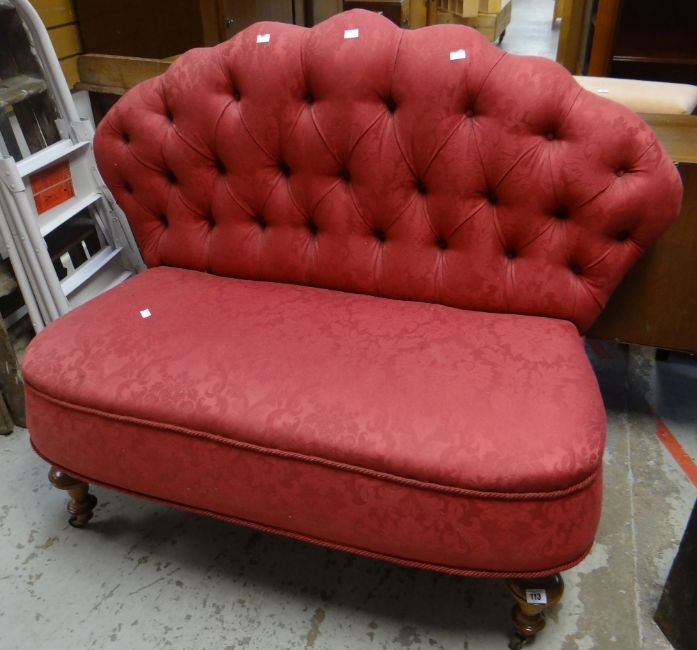 An antique button back fan-shaped settee on turned walnut supports with castors